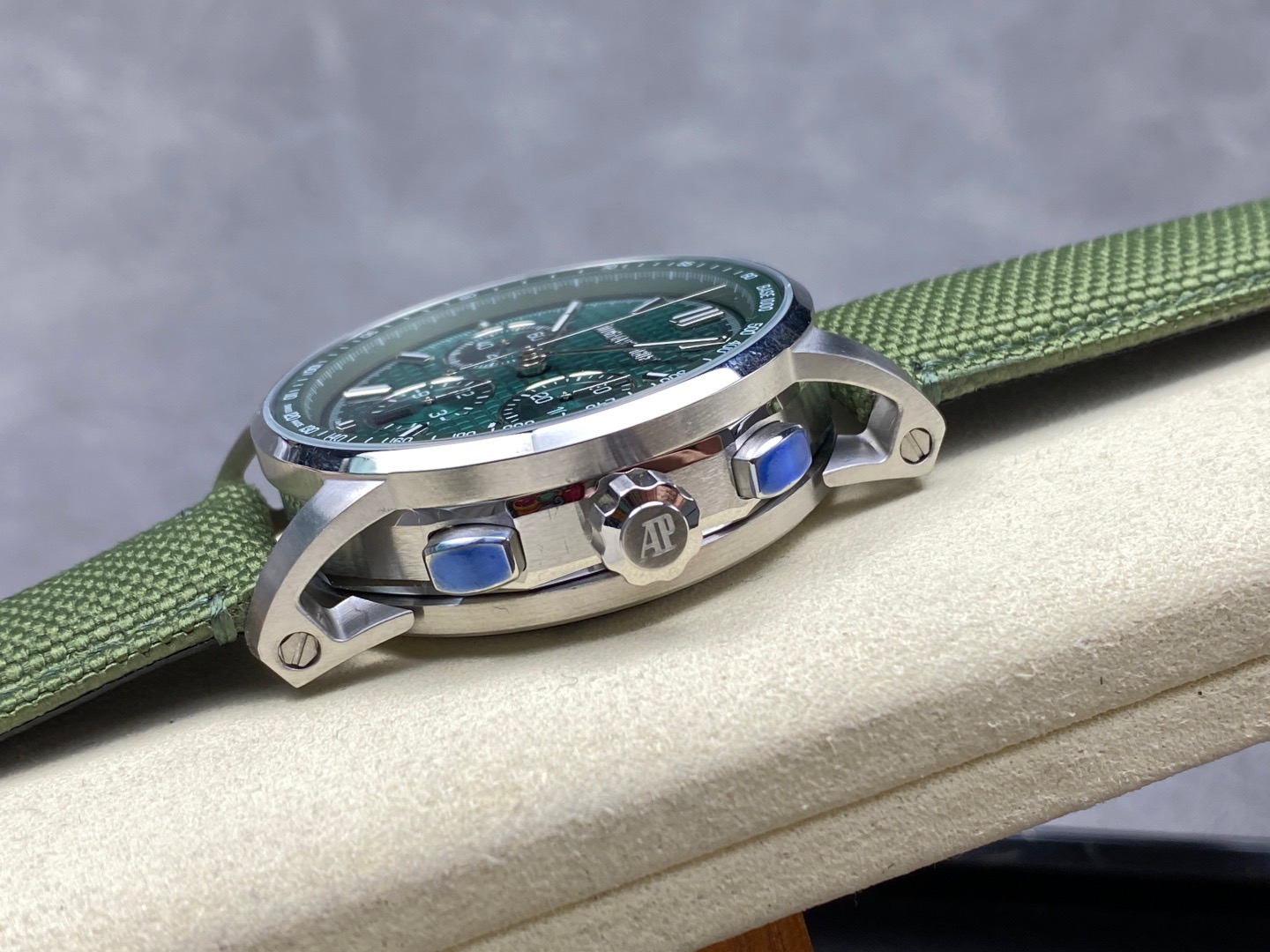 Audemars Piguet Royal Oak “Grande Tapisserie” chronograph 26574 is a 1:1 Superclone. It features a 41mm stainless steel case, a silvered “Grande Tapis…