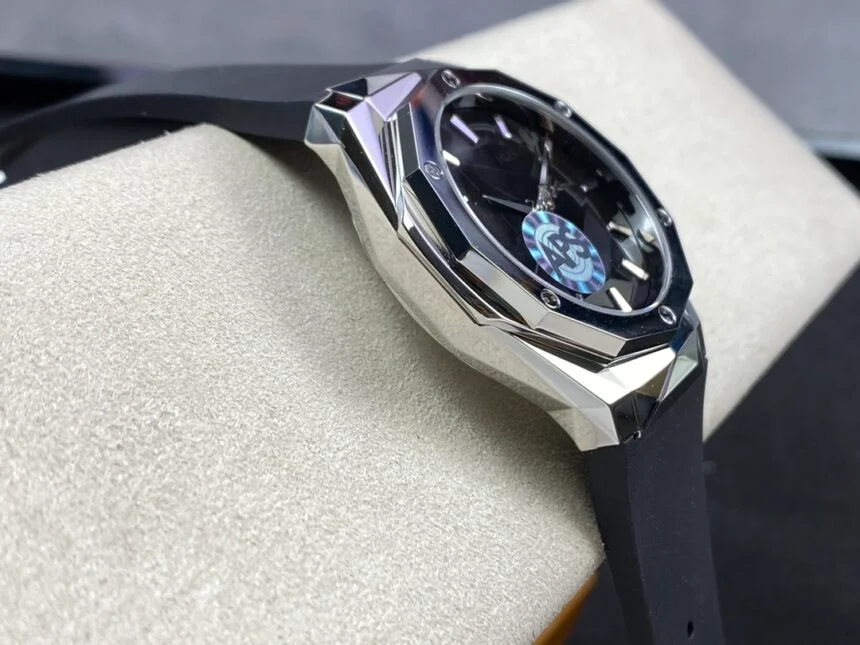 Orlinski’s signature faceted design on the case and bezel, giving it a unique and modern aesthetic