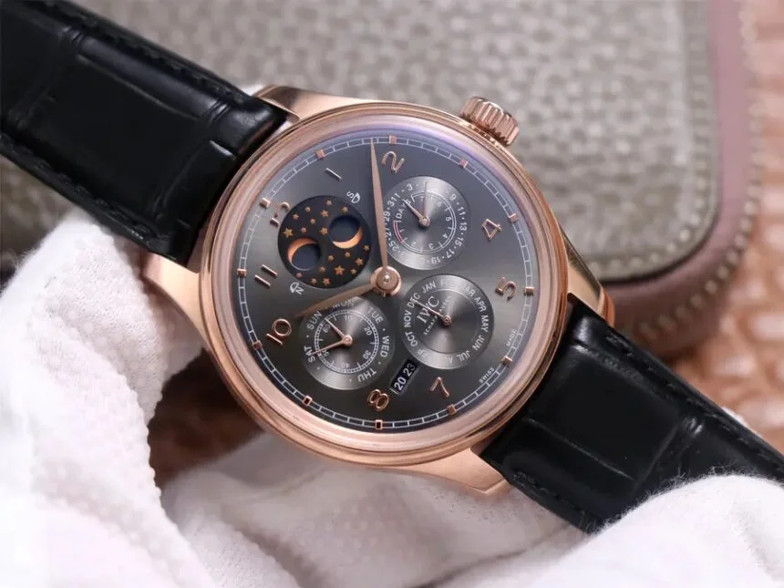 Portuguese series IW5034.01 million calendar watches, the first true permangeable calendar, the use of imported large fine work as the basis for the movement upgrade to 52610 movement, not only to achieve most of the functions and walking stability, repair rate is very low, this is the re-engraving market rarely imperficable complex function watch. Reason to start with: 1, 10,000-8-point position Perennian calendar year normal operation (2017-2024, 2024 free return to the factory to replace the year module), as the original can be adjusted by the case hide button, and better than the original reversible (original) The year is irreversible, after the adjustment is to be repaired at your own expense); 2, the sun and moon star (annual calendar) – date (3 o’clock), month (6 o’clock), week (9 o’clock) are all normal transmission operation, and can be manually adjusted (date by pulling out the second gear two-way adjustment, Month through the 8-point hidden button adjustment, the week can be driven by adjusting the pointer); 3, exquisite workmanship – both inside and outside, German CNC equipment open mold case strap, later manual one by one QC, the shell of each place of the rash and invert almost comparable to the original, movement text font distribution synchronization original, fish scales and other pattern grinding details are very delicate. The arched scratch-resistant mirror is as permeable as the original. 4, hand elegant – size 41 x 13