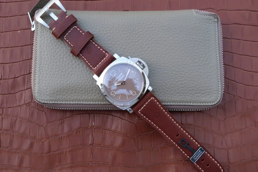 Genuine Leather Strap equipped with Stainless Steel V Buckle with Panerai Markings/Engravings. Flush Lug Screws