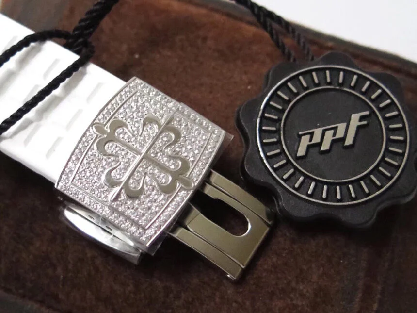 Black Rubber Strap with 904L Stainless Clasp encrusted with Lab Created Diamonds complete with Patek Philippe Markings and Engravings