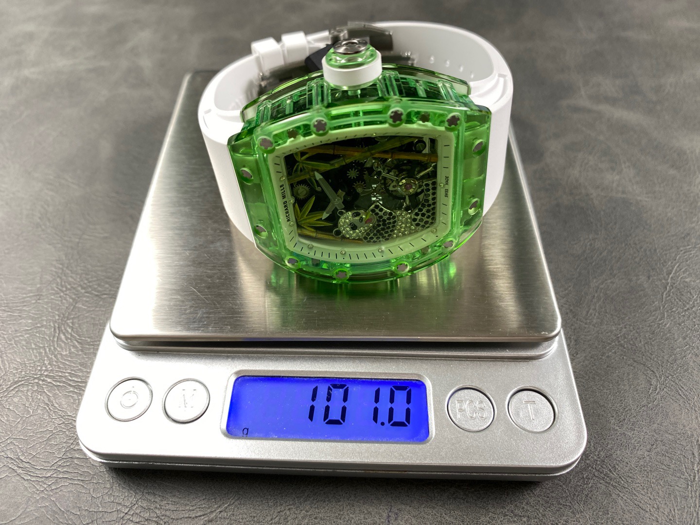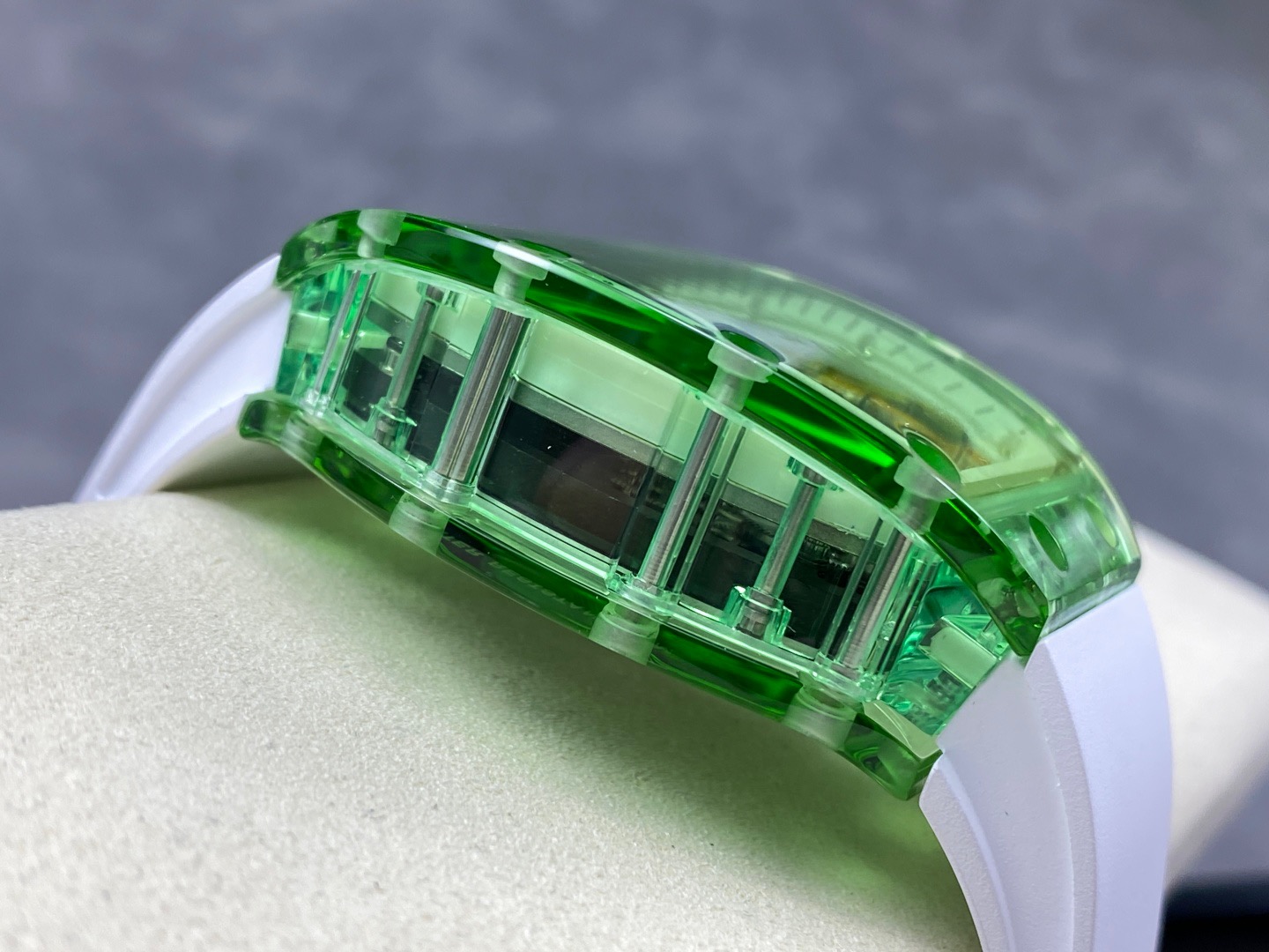 The curved crystal wine barrel case is designed with complex and difficult lines or angles, which have undergone countless tests during processing and production, bringing huge challenges to the production. Its bezel, middle case, and back cover are all made of crystal clear material and embedded with titanium alloy screws, achieving a perfect harmony between the surface and internal depth. The double hollow bottom plate allows the movement to be displayed from various angles.