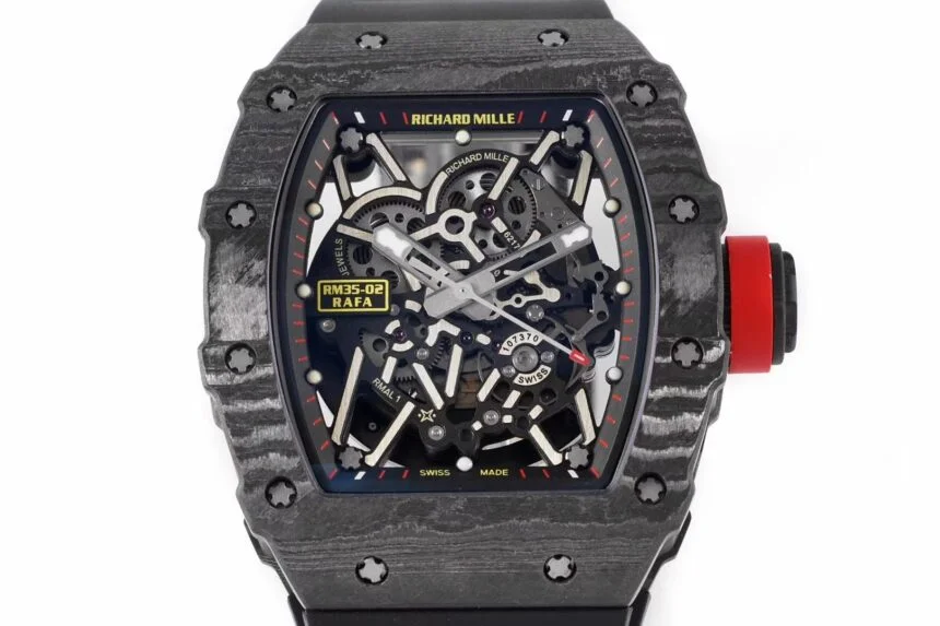 ABD (All Black Department) an internationally renowned Richard retrofit plant, to launch the ultimate version of RM35-02. 1. It took four years, the only RM copy with the original open mold; 2. The use of RM original NTPT carbon fiber to create an all-carbon case, NTPT carbon flower cloud pattern, waves, are through the ABD shellmaker’s hand-polished decoration, the upper hand state invincible; 3. The whole table and the original assembly structure consistent; 4. All through 3 bar waterproof detection; Custom version of RMUL3 movement, hair box and gears move with the adjustment; Richard 035 glass, glue rings on the head, rubber straps, titanium buckles can be used in the original.Rubber Strap, SWISS Tourbillon Manual Winding