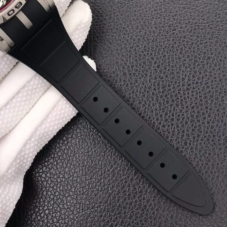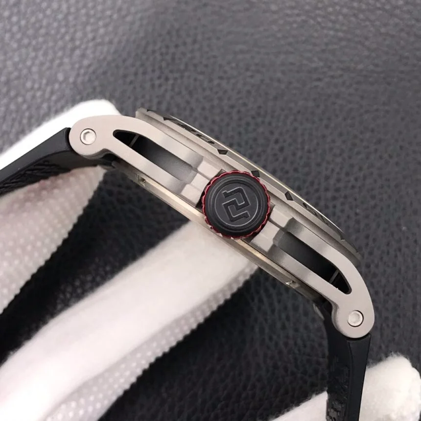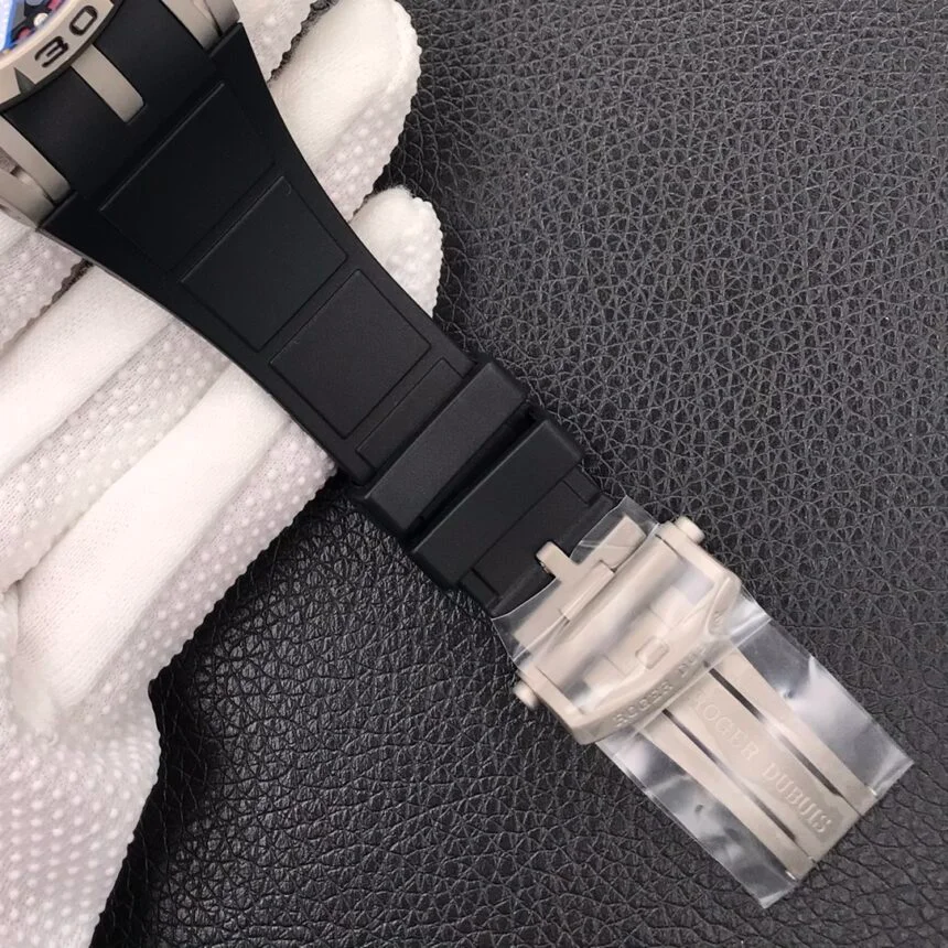 The BBR Roger Dubuis King Series Titanium Tourbillon Model: RDDBEX0479 is a high-end Superclone watch that is made to resemble the original Roger Dubuis King Series Tourbillon watch. It has a titanium case that is 45mm in diameter and 13.5mm in thickness. The watch is powered by a seagull custom RD505SQ winding movement, which is accurately adjusted in six directions and has a power reserve of up to 50 hours. The dial is hollowed out and features a luminous scale, black DLC coating, and a second dial in layered titanium. The hands are covered with a luminous coating for easy and clear reading. The watch is also equipped with a sapphire crystal glass with anti-glare coating and a natural rubber strap imported from Germany.