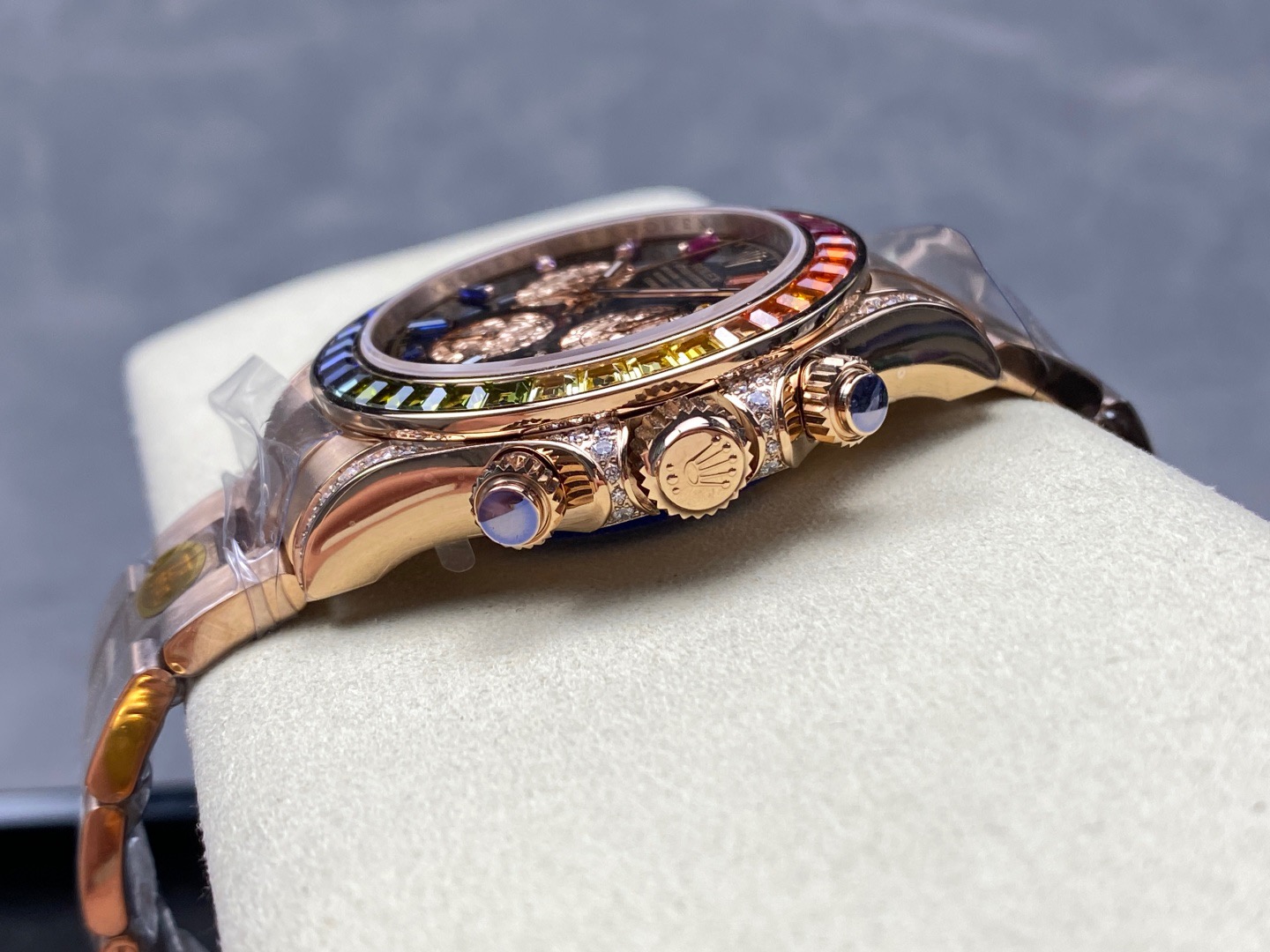The essence of Rainbow Daytona lies in the outer gemstones with color gradients. Natural gemstones are more or less defective, and the gemstones used will be optimized to achieve a pure, translucent, and rich texture. ZF factory selected and matched the 36 gems with the most harmonious color gradient transition from tens of thousands of gems. The most difficult part is that the watch is a small-scale production model, and the required gradient gemstones are not just one set, but at least dozens of sets, in order to produce the corresponding number of watches, resulting in very scarce production.